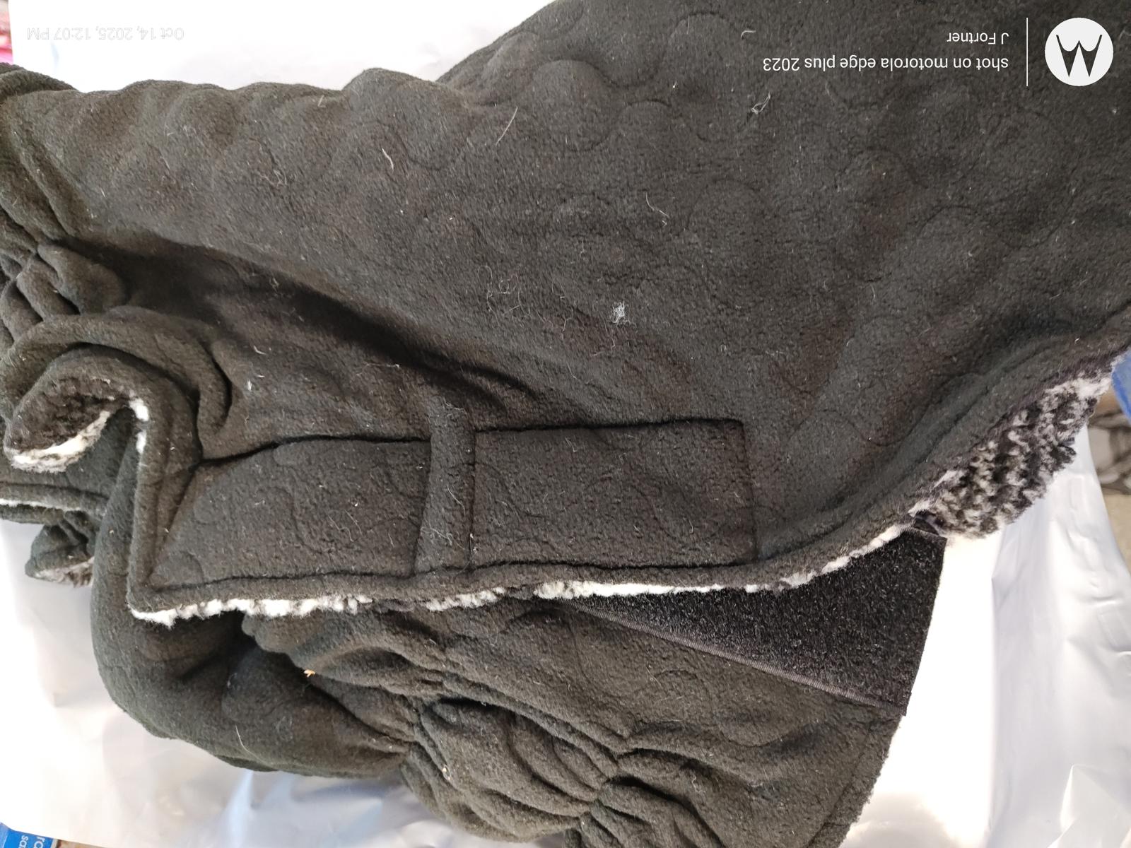 Nice feel of lamb wool soft and Reversable Plaid on one side black on the other. wide strong velcro attachments and no need to pull over pets head easy to put on and off.