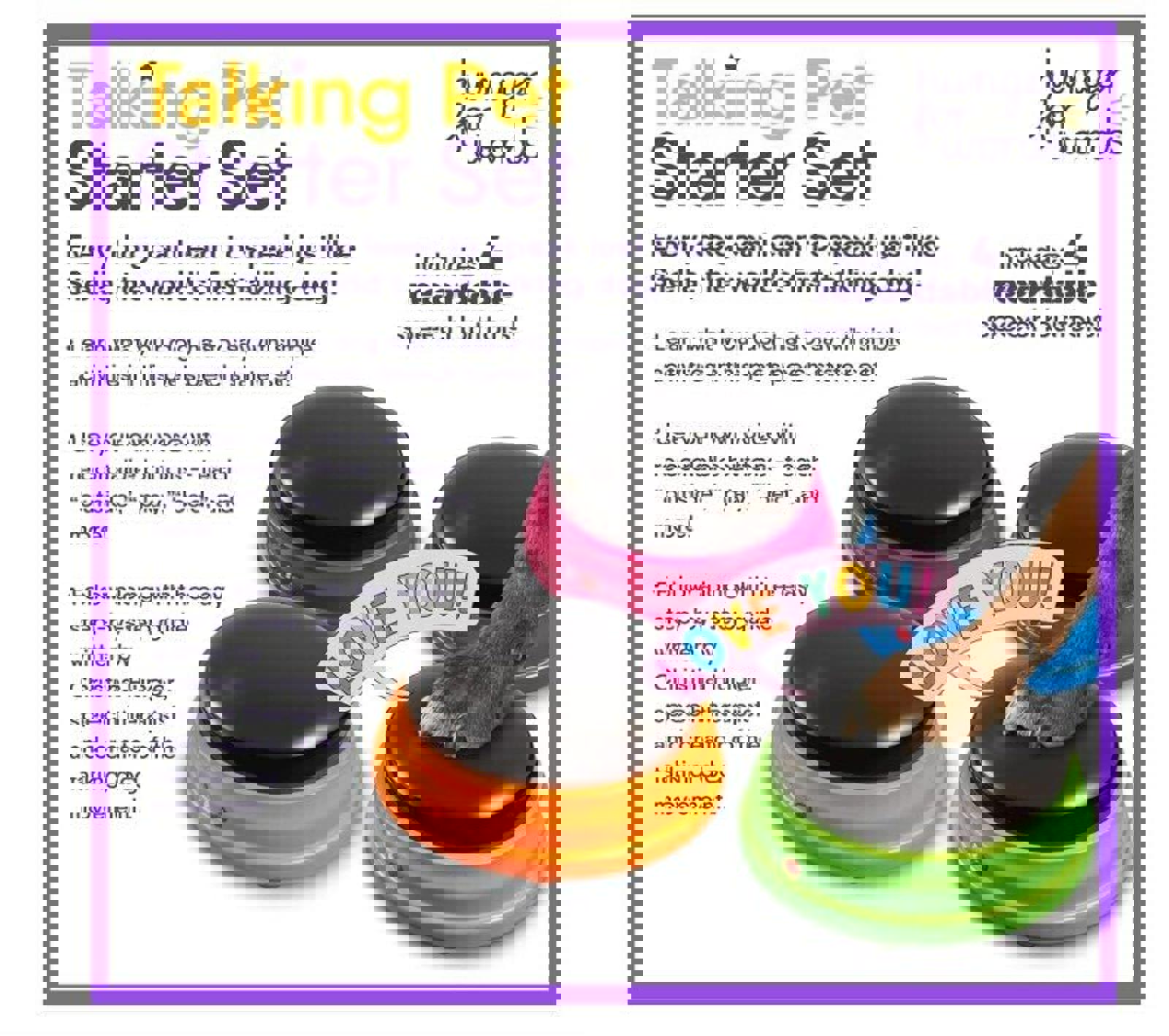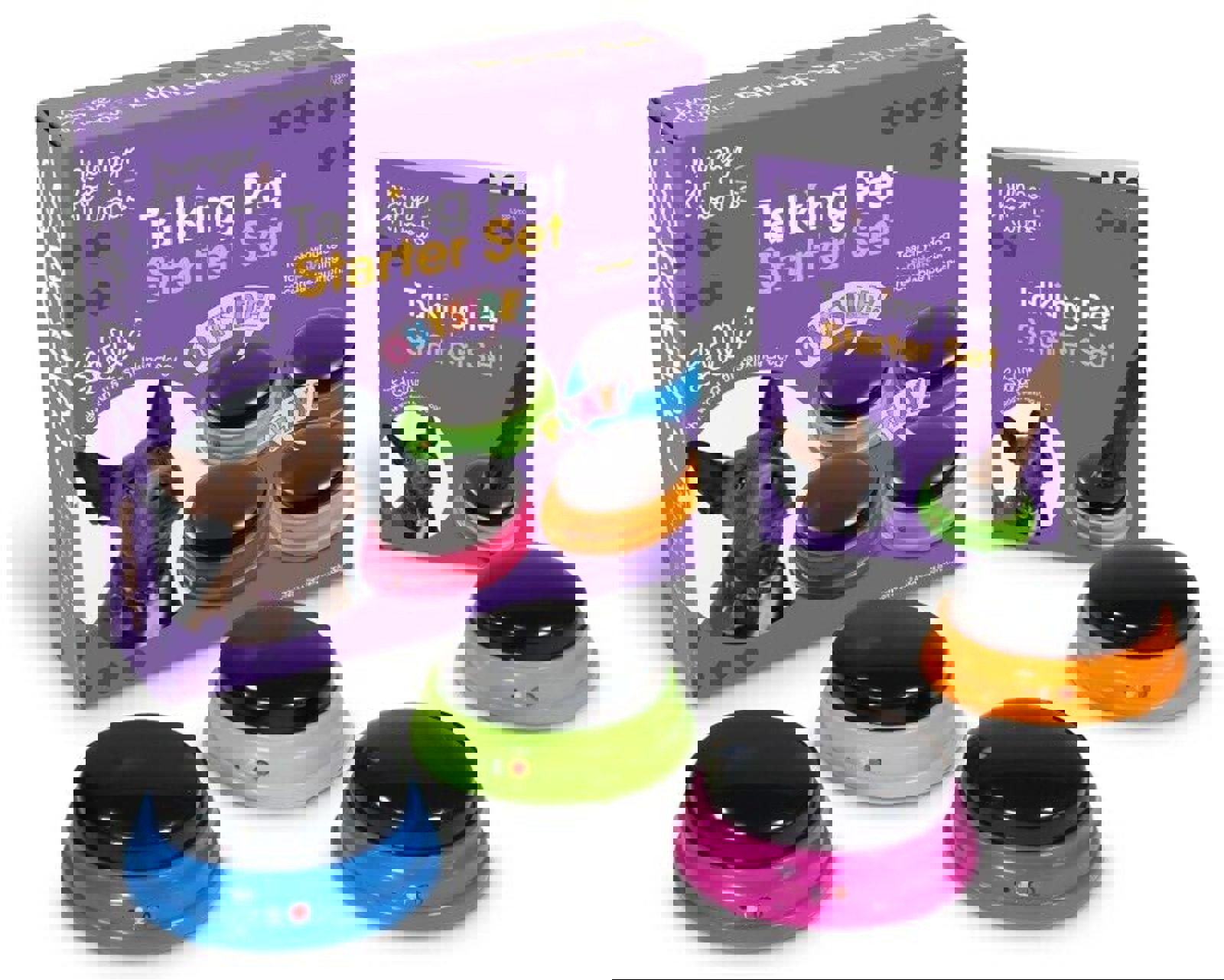 The Hunger for Words Talking Buttons Starter Set is a creative and interactive way to communicate with your furry friend. This set includes 4 round recordable buttons with a colorful design, allowing you to record simple words like "outside" or "play" using your own voice. The activity guide provides ideas for training and engaging your dog in interactive play, making it a fun and educational toy for pets of all ages. Perfect for dog owners looking to enhance their bond with their furry companion through communication and training.