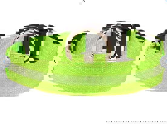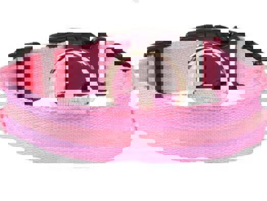 7 Colors LED Lights Dog Collars Night Safety Flashing Nylon Nylon LED collar helps keep your pet visible up to 350 yds. Choose from 3 modes—on, strobe and blink. Comes with a slim bulb strip and a small on/off box, which works in any weather condition. Battery operated two small battries easy to change last for hours and hours Adjustable in each size so can grow with puppies or unsure about exact fit just need the range. Light tube removable for easy collar washing