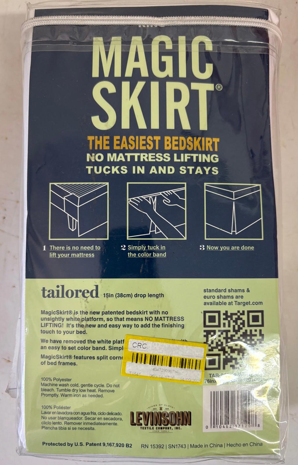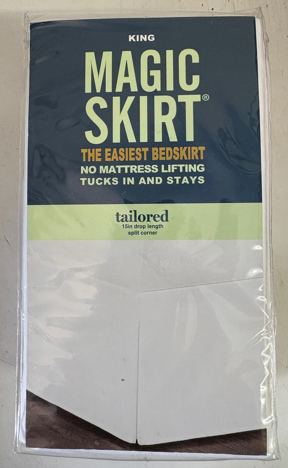 Tailored Bed Skirt by Magic Skirt fits beautifully, without lifting your heavy mattress! The revolutionary wraparound bed skirt is now in a longer, more convenient 15-inch drop length with a heavier. This easy-to-use patented design works on any style of bed, including headboards, footboards, adjustable beds and more. Sleek mitered corners and pleated sides stay locked in place for a clean, streamlined look. Magic Skirt features a hidden fabric band and elastic strip at the head of the bed that eliminates the unsightly white platform for a neat, no-sagging appearance. Detaches easily and quickly. Includes six bed skirt pins for an extra-secure hold! Made from easy-care 100% microfiber polyester that is wrinkle resistant, pre-shrunk and colorfast.