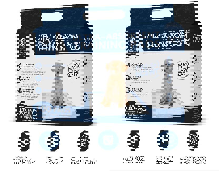Experience hassle-free housebreaking with the American Kennel Club Scented Puppy Training Pads. Each pad measures 22 x 22 inches, perfect for accommodating your puppy's natural instinct to mark their territory. The quick-dry gel formulation ensures a reliable shield against accidents, while the appealing white and blue color adds a touch of style to your training routine.Designed to suit any dog size, these pads are an essential for puppy parents. The package dimensions of 15.83x13.03x4.88 Inches make them easy to store, and the 100-count quantity provides ample supply for busy days. With a weight of 6.16 pounds, these pads are durable and withstand frequent use, ensuring your home remains protected and smelling fresh.